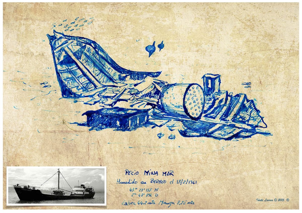 A la mañana partimos pronto a bordo del Carlota hasta el punto de inmersión. Fué un descenso suave hasta los 35,5 metros con una visibilidad regular pero enseguida vimos la silueta del Mina Mari.